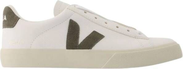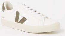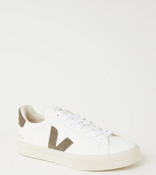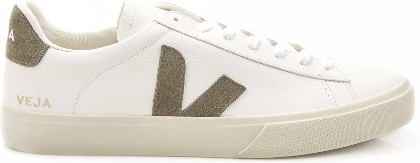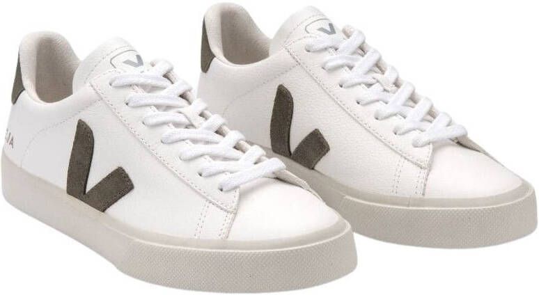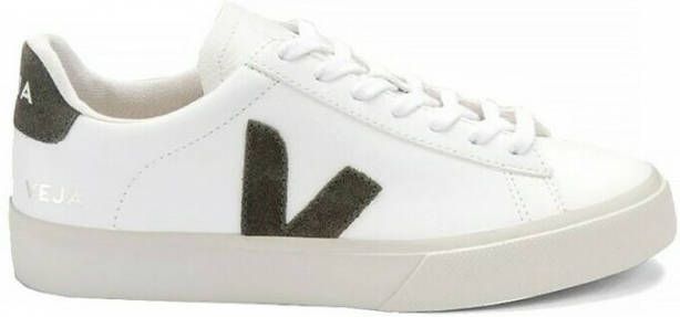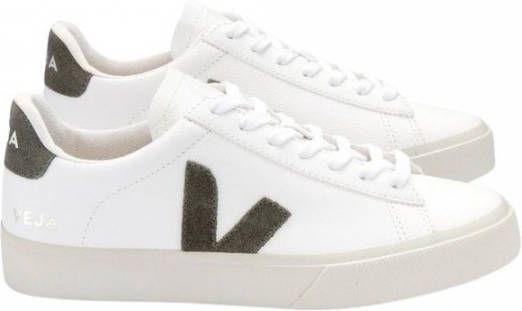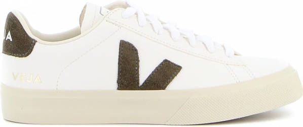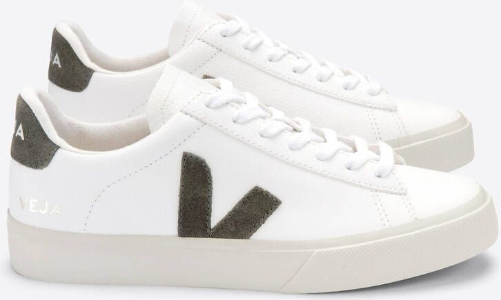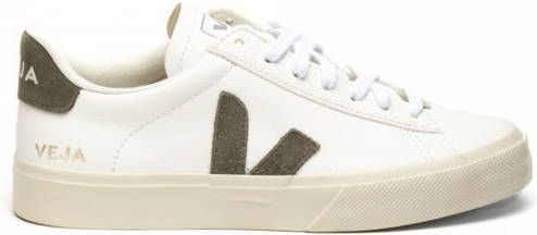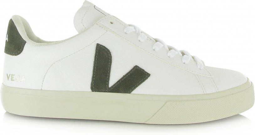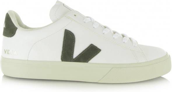 De Veja CAMPO in de kleuren wit en kaki. De buitenzijde is gemaakt van leer en heeft aan de zijkanten een rubberen V-logo in de kleur groen. De binnenvoering is gemaakt van textiel. De clean white look i.c.m. de groene/kaki details zorgen voor een sportieve maar zomerse uitstraling.